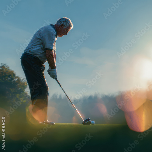 elderly man stands focused with a golf club, ready to hit the ball as the morning sun rises behind him, evoking calm, precision, and passion for the sport