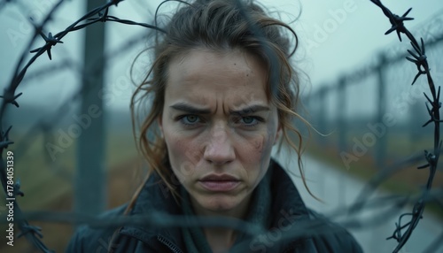 Woman face looks worried through barbed wire. She has dirt on her cheek and a tense expression. Foggy background suggests a harsh environment. Symbolizes struggle, confinement, and mental strain.