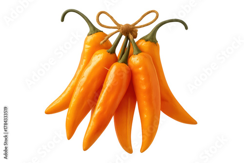 Yellow chili peppers tied in a bunch, fresh capsicum, spicy vegetable for cooking, transparent background