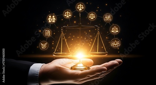 Concept of legal justice with a scale in a hand, surrounded by icons symbolizing law and order and the legal process