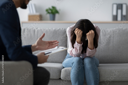 A woman is sitting on a couch, visibly distressed and crying while covering her face. A psychologist sits nearby, offering support and guidance during the therapy session.