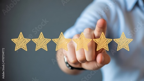 Service Assessment: A hand reaches out to touch golden stars, symbolizing the user's positive feedback, the customer service experience is rated and the appreciation is given