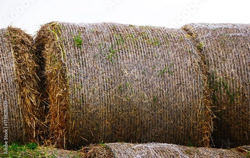 Duży bal słomy stoi poustawiany na innych balach, zapakowany w siateczkę. Scena pokazuje składowanie i przygotowanie słomy.