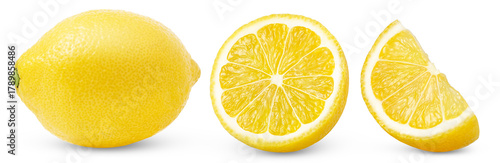 Set of lemon fruits, slice and half isolated on a white background, Collection of fresh juicy lemons, clipping path