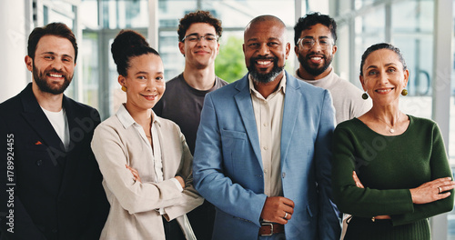 Happy, crossed arms and portrait of business people in office with manager for company about us. Smile, collaboration and team of professional attorneys with pride for law career in workplace.