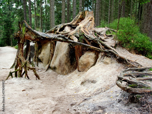 Niesamowity korzeń umiejscowiony na skale piaskowca w zielonym lesie - rzeźba natury