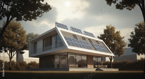 Modern minimalist house with a slanted roof covered in solar panels, surrounded by trees