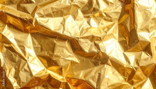 金色の紙がしわを帯びて複雑に反射する質感豊かな抽象壁紙背景素材の描写