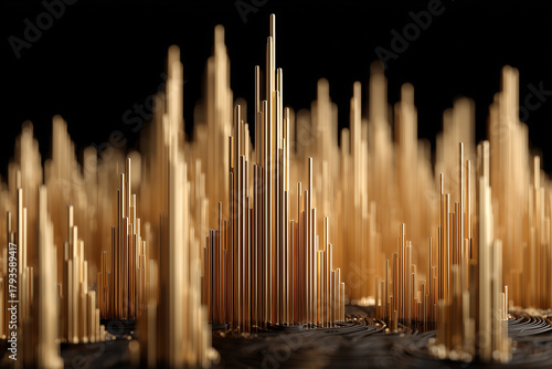 Abstrakcyjna, cyfrowa wizualizacja złotych słupków lub kolumn o różnej wysokości, wyrastających z ciemnej, teksturowanej powierzchni. Przypomina wykres słupkowy lub futurystyczne miasto.