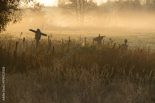 Strachy na ptaki stojące na porannej, zamglonej łące o świcie. Delikatna mgła i miękkie światło tworzą tajemniczą atmosferę, podkreślając sylwetki figur na tle spokojnego krajobrazu.