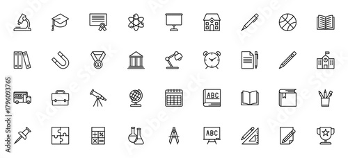 School icon set. Education vector icons pack. Minima outline icons including mcroscope, diploma, globe, alculator, books, pencil, chool bus and more. Editabe stroke.