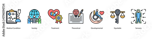 Health and Disability Awareness web banner illustration featuring Medical Condition,Society, Treatment, Theoretical, Developmental, Equitable, and Sensory. Promotes inclusive healthcare understanding.