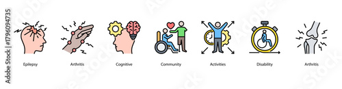 Neurological and Community Support web banner illustration featuring Epilepsy,Arthritis,Cognitive,Community,Activities,Disability, and Arthritis. Encourages health participation and social inclusion.