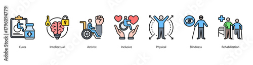 Inclusive Rehabilitation web banner illustration featuring Cures, Intellectual, Activist, Inclusive, Physical, Blindness, and Rehabilitation. Focused on empowerment and recovery for all abilities.