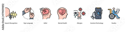 Assistive Communication web banner illustration featuring Speech Recognition, Sign Language,ADHD,Mental Health,Allergies, Assistive Technology, and Studies. Supports technology for accessible living.