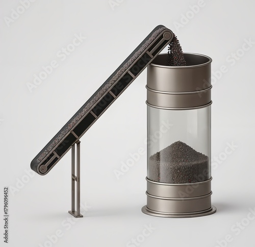 3D illustration of an inclined belt conveyor loading granular bulk material into a transparent storage silo. Concept of bulk solids handling and industrial material logistics/storage.