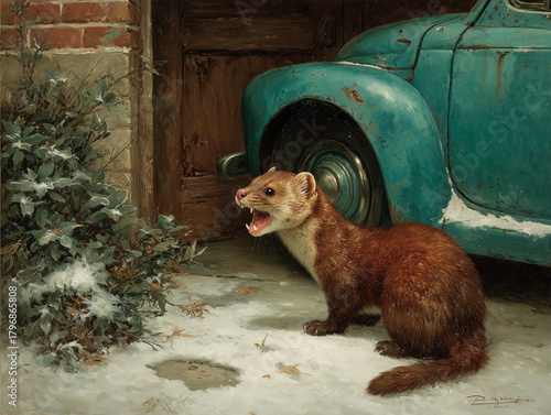 Realistyczny obraz kuny (gronostaja) z otwartą paszczą, stojącej na zaśnieżonym podwórku, obok zabytkowego, turkusowego samochodu i ceglanej ściany.