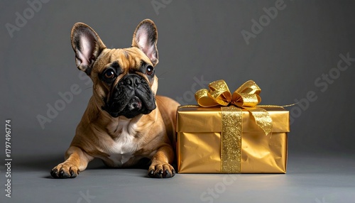 マットなチャコールグレー背景の上で、フレンチブルドッグが金色のラッピングギフトの隣に静かに横たわっています。