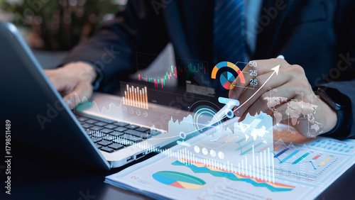 Investment and finance growth concept. Businessman analyzing money, profit, income, and financial data for economic success, business development, and long-term investment strategy.