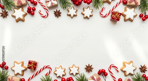 Festive christmas border frame with star cookies candy canes pine branches and red berries on a neutral background