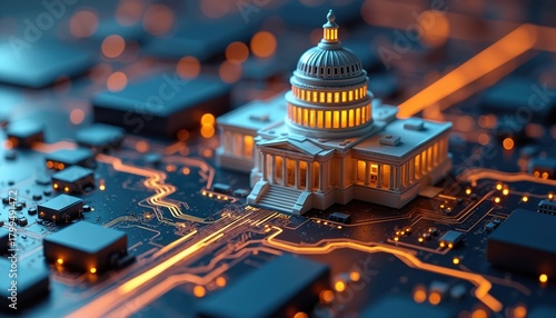 Futuristic digital circuit board with miniature government building model. Glowing orange lines show data flow, connections. Modern tech integration symbolizes advanced administration, future policy.