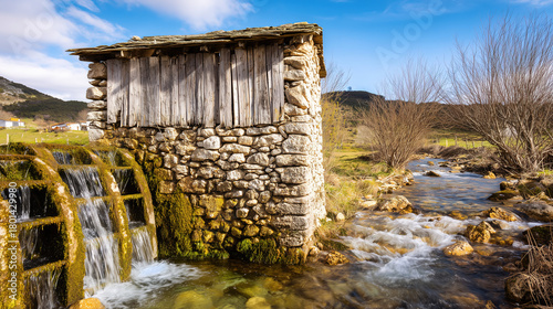 Ancient watermill with stone grinding wheels by a riverside, rustic wooden structure. safety posters.