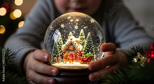 A child's hands carefully holding a magical Christmas snow globe, revealing a festive winter wonderland scene inside