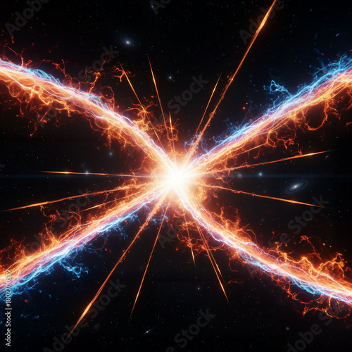 Dramatic visualization of a cosmic collision or massive energy burst in deep space, featuring intersecting flows of vibrant blue and orange plasma.
