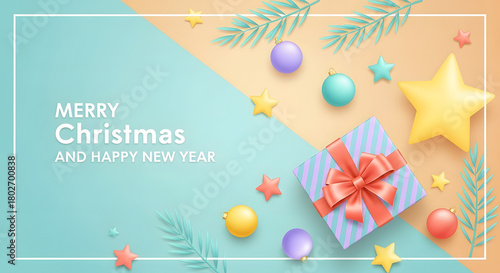 Merry Christmas and Happy New Year holiday festive greeting card 3D render cute pastel aesthetic background gift box stars ornaments tropical leaves minimal design