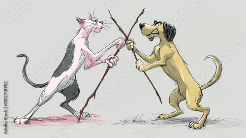 Ai cat and dog battle with sticks in a comical showdown in a playful scene