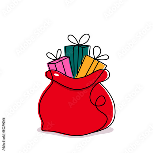 Santa Claus's bag full of gifts. Flat vector in linear style. Template for a greeting card for New Year and Christmas. Vector illustration isolated on white background.