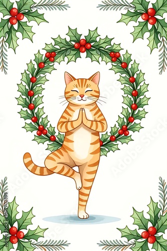 A happy orange cat stands on one leg in a yoga pose inside a holiday wreath. Green holly leaves and red berries frame the scene, adding a cheerful seasonal touch.