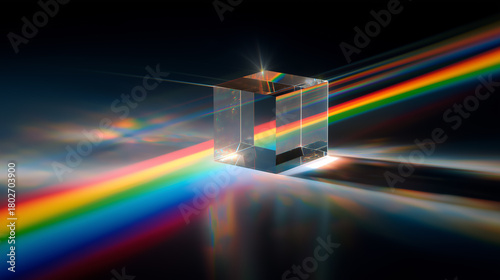 Crystal prism splitting light into vibrant rainbow spectrum on dark background