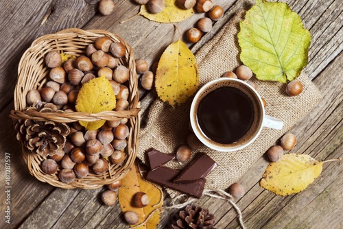black coffee on wooden table with chocolate , hazelnuts, and fallen leaves decoration. on wooden table. top view