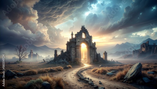 崩れた門に差し込む神秘の光景