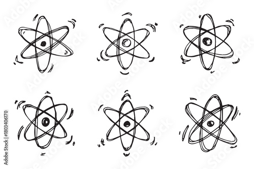 Set of hand drawn atom sign Molecule clipart in doodle style Symbol of science, education, nuclear energy, scientific research, molecular chemistry Single element for print, web, design