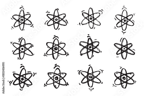 Set of hand drawn atom sign Molecule clipart in doodle style Symbol of science, education, nuclear energy, scientific research, molecular chemistry Single element for print, web, design