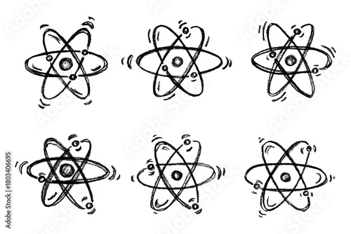 Set of hand drawn atom sign Molecule clipart in doodle style Symbol of science, education, nuclear energy, scientific research, molecular chemistry Single element for print, web, design