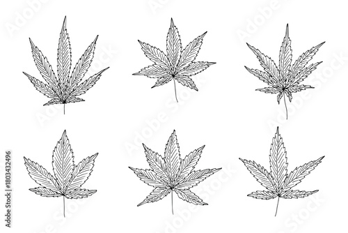 Set of hand drawn cannabis leaf Medicine marijuana Hemp leaves clipart in doodle style Single element for print, web, design, decor