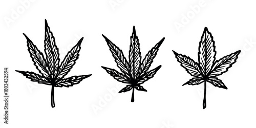 Set of hand drawn cannabis leaf Medicine marijuana Hemp leaves clipart in doodle style Single element for print, web, design, decor