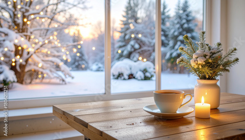 冬の静寂:白銀の世界と朝焼けを望む、心安らぐ北欧風のカフェタイム