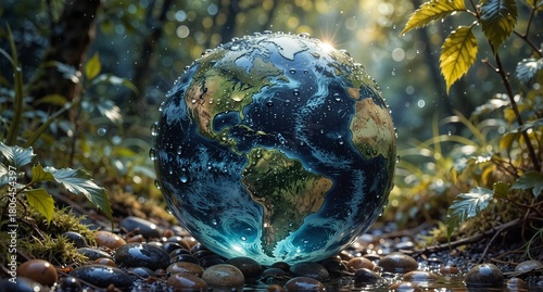 a glistening earth globe rests among lush forest foliage and wet river stones, symbolizing environmental conservation.