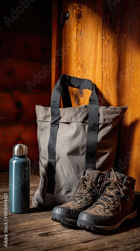 A hiking setup featuring sturdy boots, a water bottle, and a tote bag, placed against a wooden backdrop, suggesting outdoor adventure.