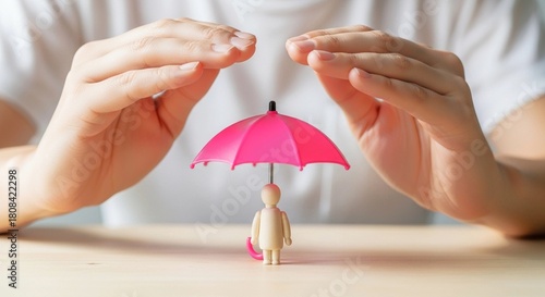 A person hands protecting a small figurine with an umbrella. Concept of insurance or security.
