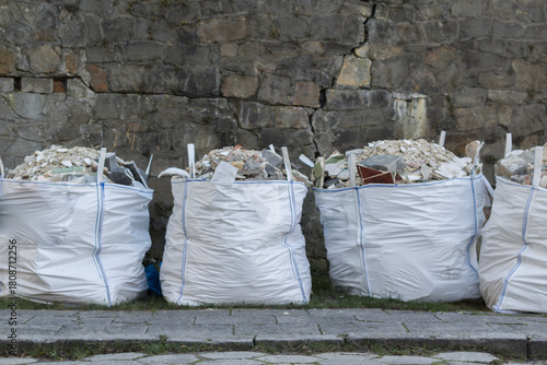 Worki big bag wypełnione gruzem budowlanym stojące przy murze miejskiej ulicy.