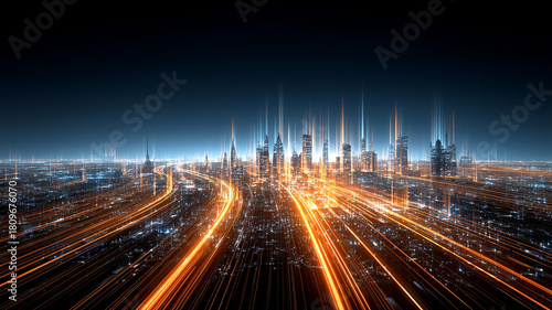 A panoramic city view illuminated by flowing orange light trails symbolizing connectivity, infrastructure evolution and digital transformation at scale.