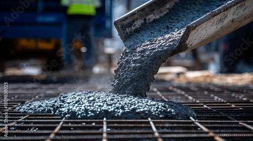 Close-up of concrete being poured onto a meticulously arranged rebar matrix, thick gray slurry flowing with controlled force, highlighting dynamic motion, industrial precision, and