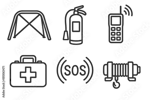 Safety Line Icons. Line style icons of safety and rescue: roll cage icon, fire extinguisher, satellite phone, first aid kit, SOS
