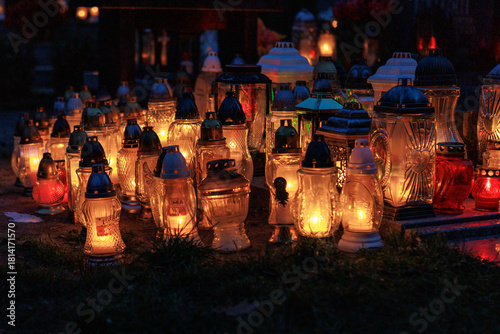 Nastrojowe ujęcie cmentarza po zmroku, gdzie jedynym źródłem światła są palące się znicze. Migoczące płomienie tworzą ciepłą, melancholijną atmosferę, podkreślając duchowy i refleksyjny wymiar miejsca