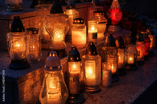 Nastrojowe ujęcie cmentarza po zmroku, gdzie jedynym źródłem światła są palące się znicze. Migoczące płomienie tworzą ciepłą, melancholijną atmosferę, podkreślając duchowy i refleksyjny wymiar miejsca